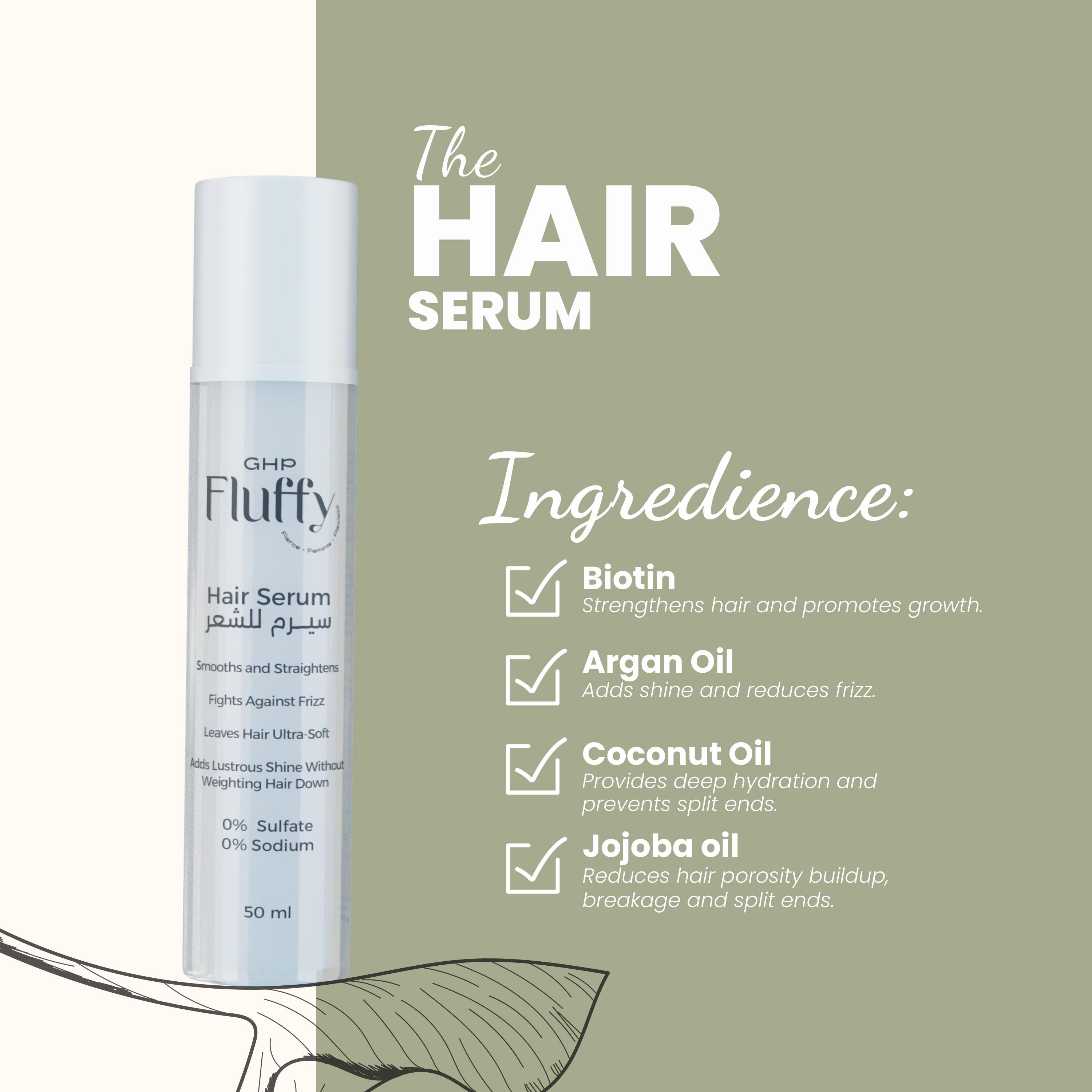 Fluffy Hair Serum is a lightweight, sulfate-free formula designed to smooth, hydrate, and strengthen hair while maintaining a natural, bouncy finish. The non-greasy texture absorbs quickly, leaving hair soft, manageable, and visibly revitalized.